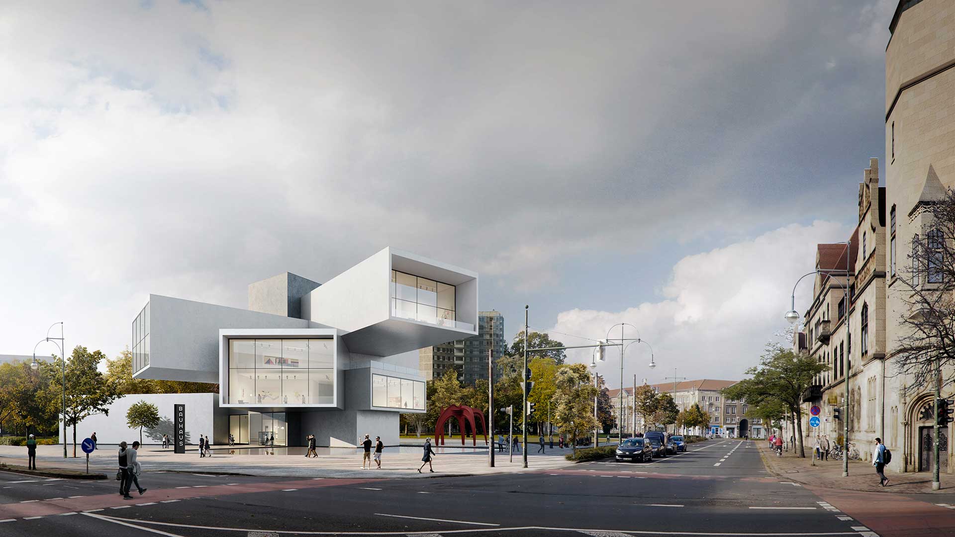 Wettbewerb zum Bauhaus Museum in Dessau. Geplant ist eine sich kontinuierlich überschneidende Raumskulptur, die alle zentralen Räume des Museum harmonisch verbindet. Die Gebäudekörper zeigen dabei in die Richtungen der Hauptströmungen des Bauhaus Dessau und dorthin, wohin sich das Bauhaus nach der Vertreibung verlagert hatte und erinnert damit an die weltweite Bedeutung dieser Kunst-, Musik-, Design und Architekturschmiede.